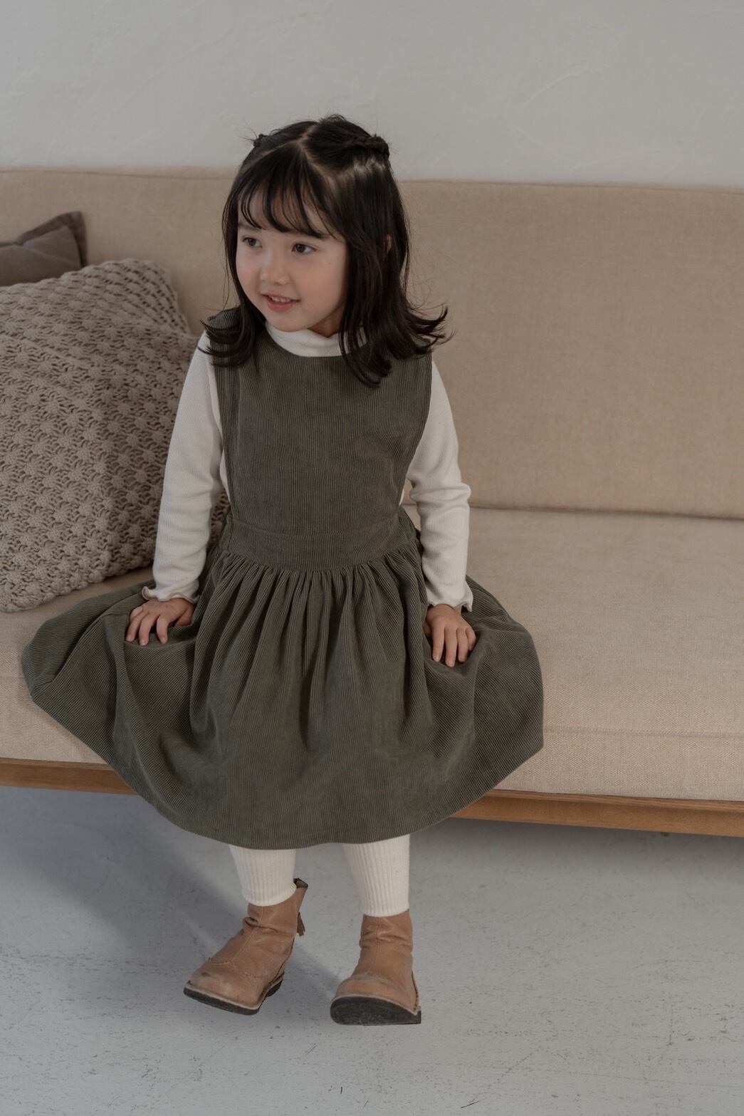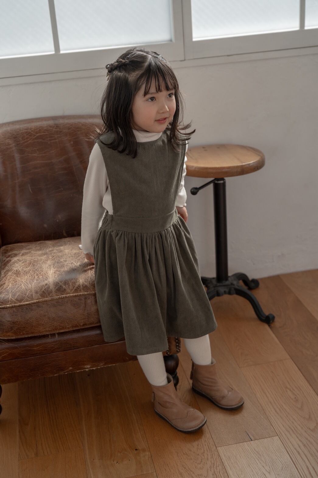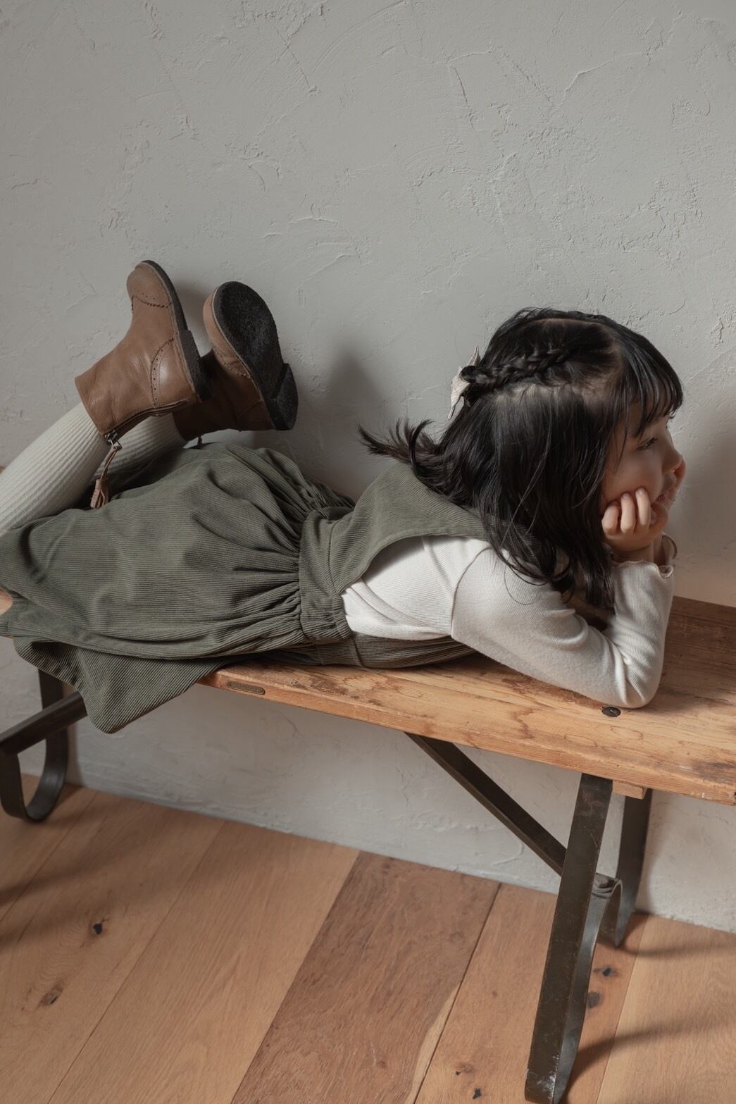 無地の柔らかいコーデュロイ生地を使用し、たっぷりとギャザーを寄せた
