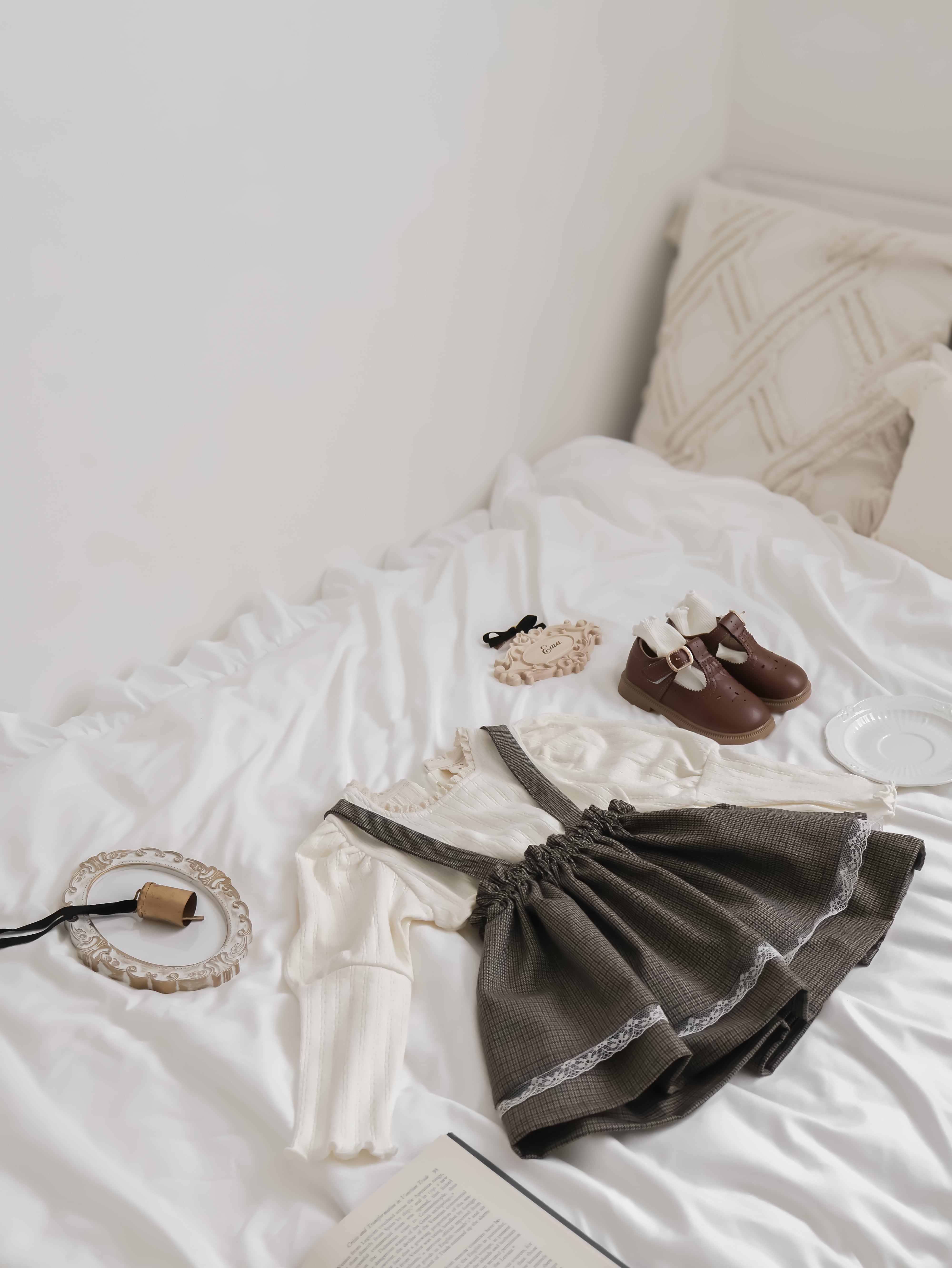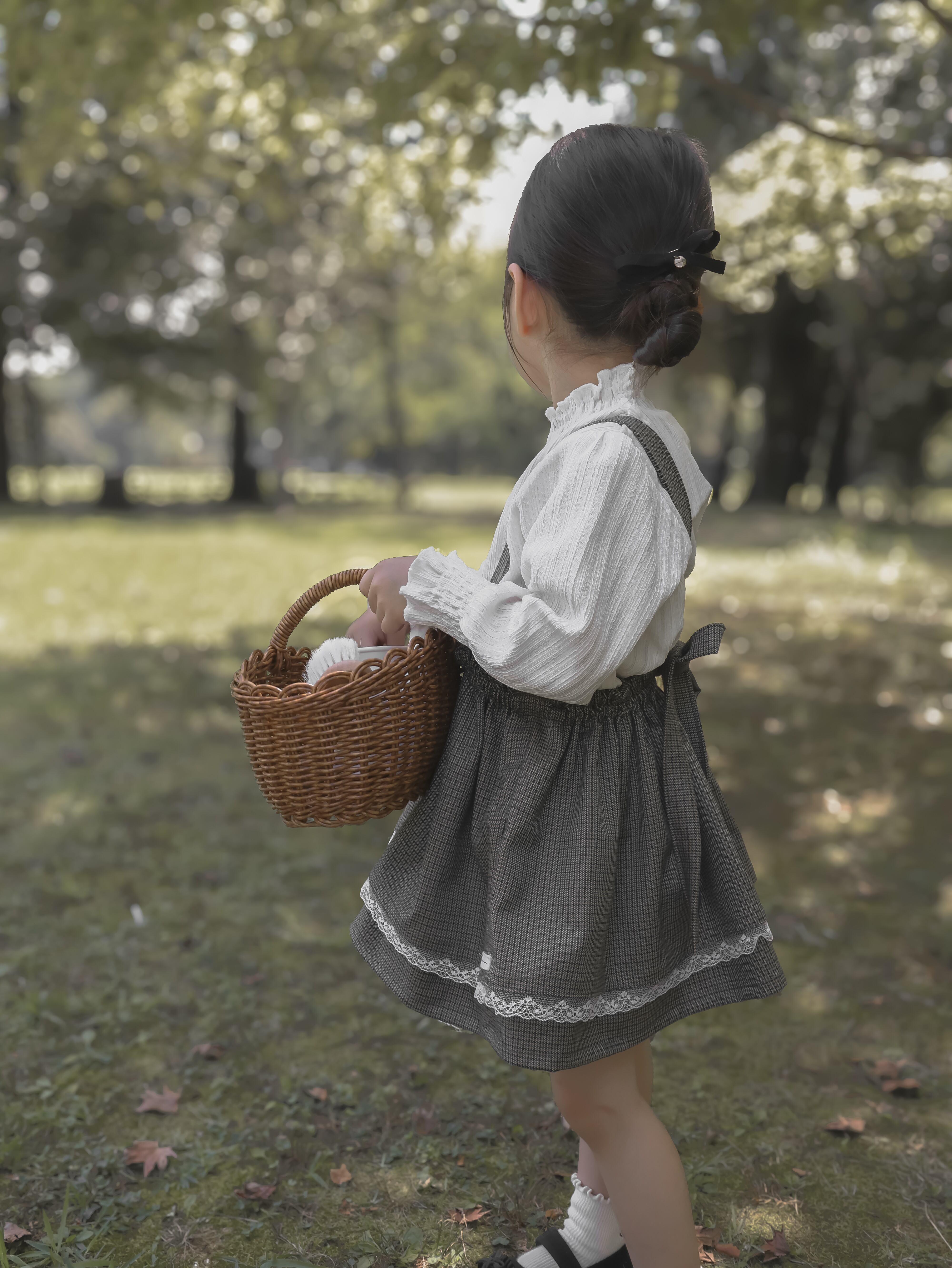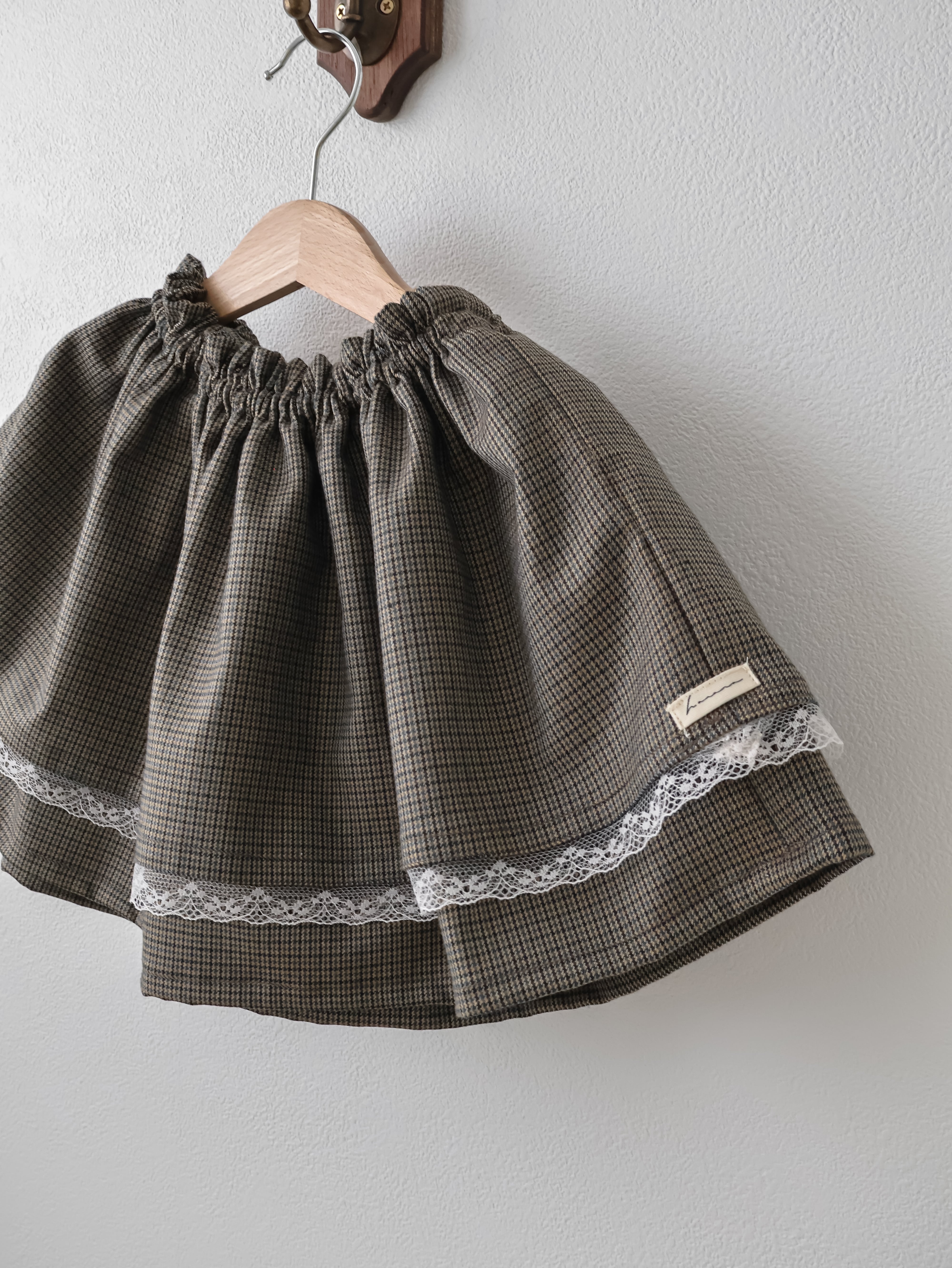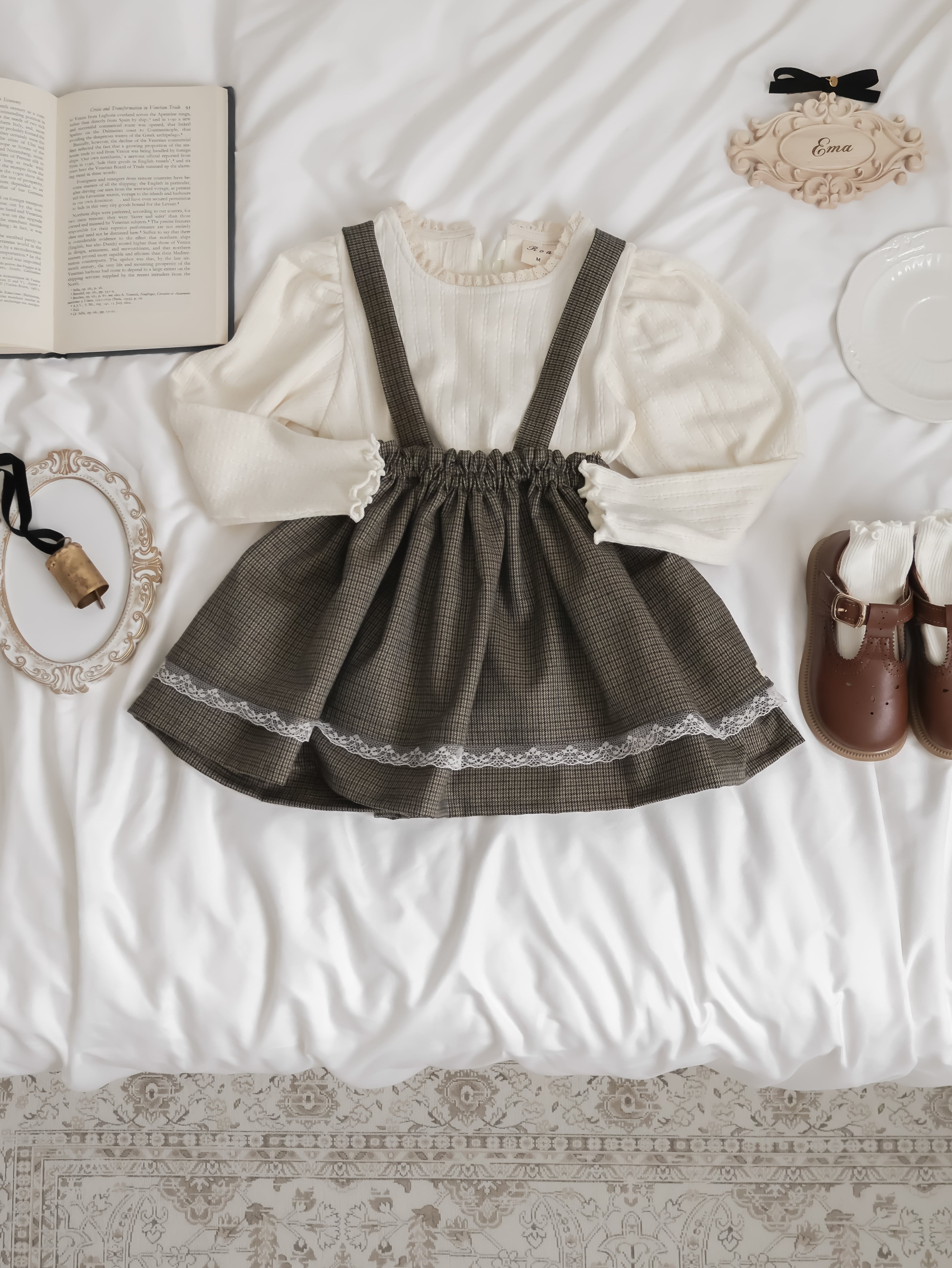 ブルーの混じった千鳥格子にアンティークな雰囲気のレースサスペンダーは調整、取り外し可能◎姉妹でも、姉弟でも楽しんでいただけるリンクアイテム。