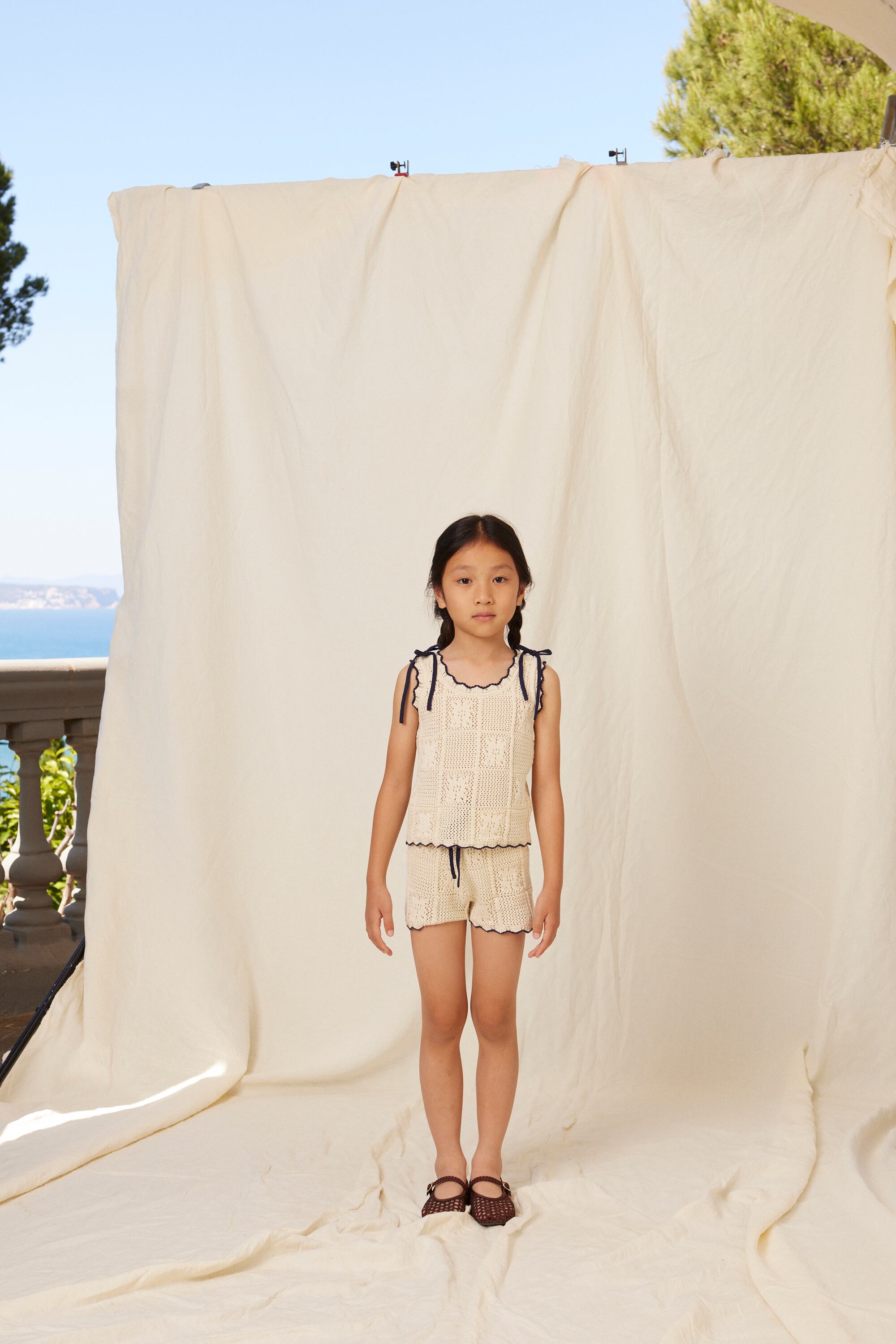 ネックラインと裾には、コントラストの効いたダークブルーのレースディテールが施され、肩にはキュートなタイが付いています。