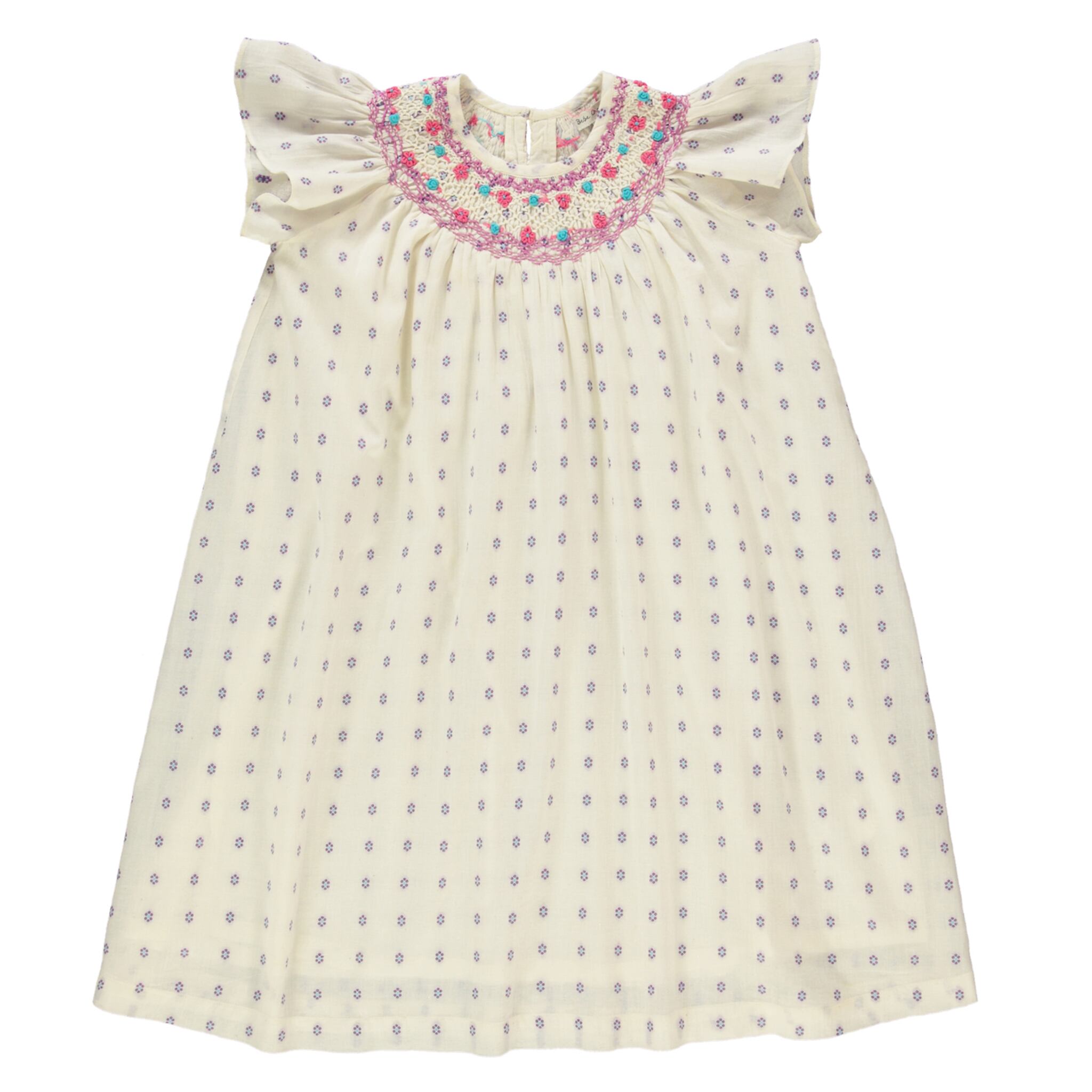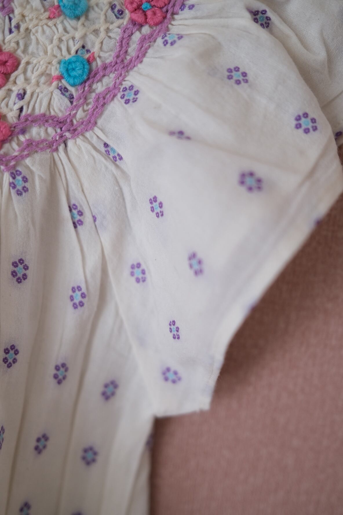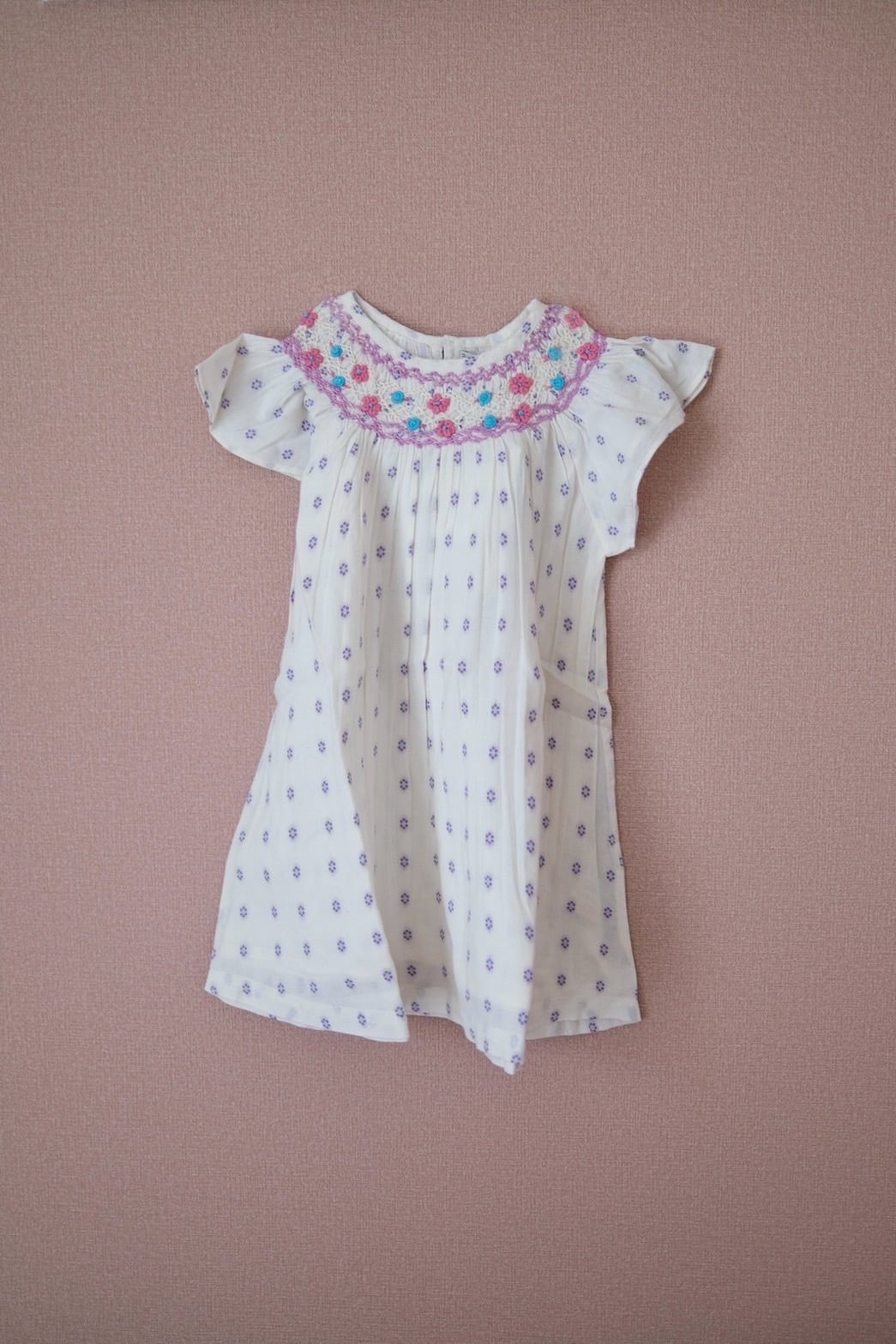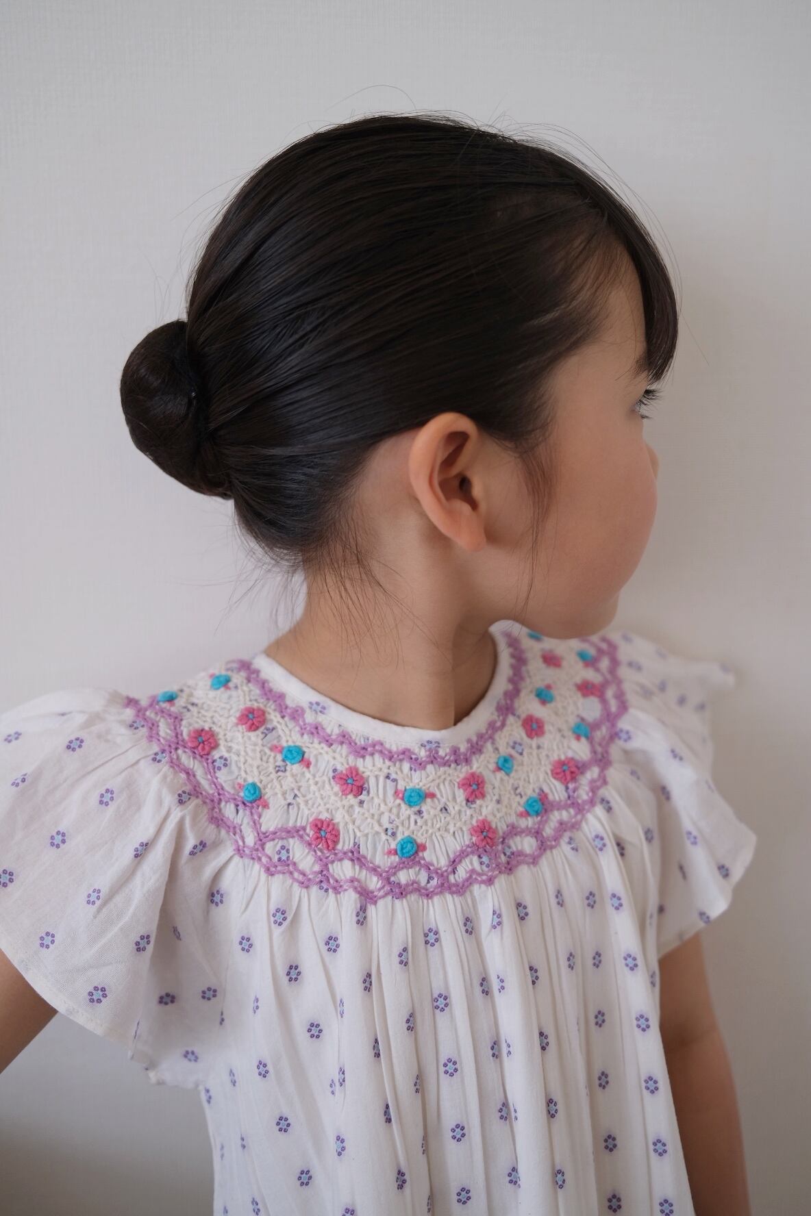 ハンドメイドの花の刺繍が施されたハンドスモックネックラインが特徴です